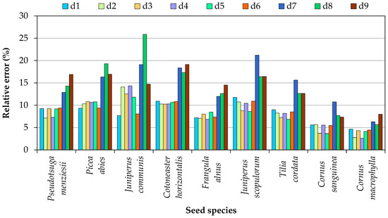 When seed volume was calculated based on two basic dimensions, the smallest error (2.7%) was noted in Cornus macrophylla (d2—formula based on the product of the square of seed length and seed thickness), and the greatest error (14.3%) was noted in Juniperus communis (d4—formula based on the product of the square of seed width and seed thickness). Therefore, volume should be calculated with the use of Formula (17) for Picea abies and Juniperus communis seeds, Formula (18) for Frangula alnus and Cornus macrophylla seeds, formula 19 for Cotoneaster horizontalis seeds, and Formula (21) for Juniperus scopulorum, Tilia cordata and Cornus sanguinea seeds. The mean error in seed volume calculations based on two basic dimensions was similar regardless of the applied formula, and the smallest error (8.2%) was noted for the equation based on the product of the square of seed thickness and seed length, whereas the greatest error (8.5%) was noted for the equation based on the product of the square of seed length and seed thickness. Somewhat smaller errors was observed when the volume of an individual seed was determined using equations based on the square of the smaller dimension (Formulas (21), (23), and (24)). The error was greater for volume calculations based on one basic dimension than two dimensions, and its mean value ranged from 14.1% to 14.7% in the seeds of all analyzed species. The smallest error was noted when the volume of Pseudotsuga menziesii, Picea abies, and Frangula alnus seeds was determined with Formula (23); when the volume of Cotoneaster horizontalis, Juniperus scopulorum, Tilia cordata, and Cornus macrophylla seeds was calculated with Formula (24); and when the volume of Juniperus communis and Cornus sanguinea seeds was calculated with Formula (25).