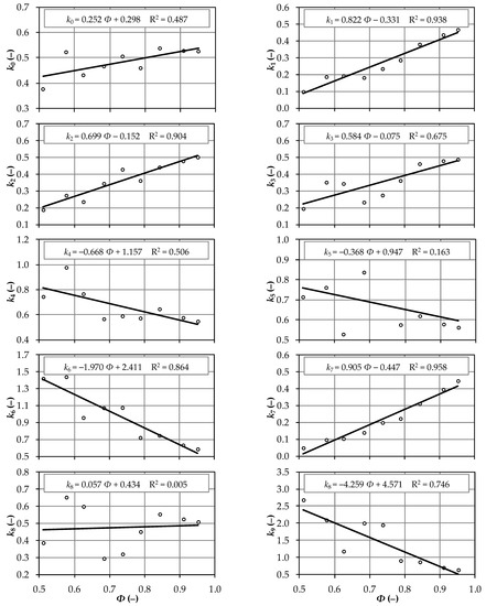 The relationships between the sphericity index, the volume coefficients of seeds, and linear regression equations are presented in Figure 3. The coefficient of determination was highest for seed volume coefficient k7, followed by seed volume coefficient k1, although high values of this parameter were also noted for seed volume coefficients k2 and k6. These observations suggest that the seed volume coefficient of a new species can be predicted based on the average seed shape factor. Seed volume coefficient k8 will be predicted least accurately. Very strong correlations in the range of 0.9 < r < 0.96 were observed in only 3 out of 10 cases, which confirms the high natural variability of seeds belonging to different plant species [18,34].