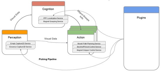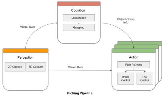 In PickingDK, a picking application is formed as a picking pipeline that represents a general process with three different steps: perception, cognition, and action. As shown in Figure 1, the perception step captures visual data from the picking scene. The visual data is then fed to a cognition step, where various algorithms are applied to analyze the input data; this step deals with piece localization and feasible grasping calculation. Finally, with the grasps computed in the cognition step, the action steps work on collision-free planning, trajectory execution, and tool control. Note that the action steps may also require visual data information in order to adapt to environmental changes such as piece reallocation.