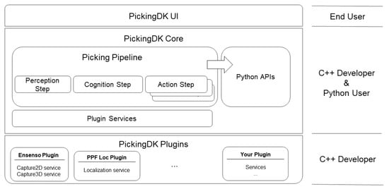 In [], an ROS-based pick and place framework is presented. Each functionality is represented by an ROS node, such as capture image, process image, robot control, and tool control. The process is orchestrated by a control node that performs the sequence of actions. This architecture is analogous to PickingDK, where functionalities are services and the picking pipeline acts as a coordinator. However, this ROS-based framework is only meant for ROS users since knowledge about ROS is required. Moreover, any modifications have to be made from scratch as no interfaces or APIs are provided. Taking that into account, its usability is very limited in the industrial context. In contrast, PickingDK overcomes this problem thanks to its user interactions levels and its ROS independence.