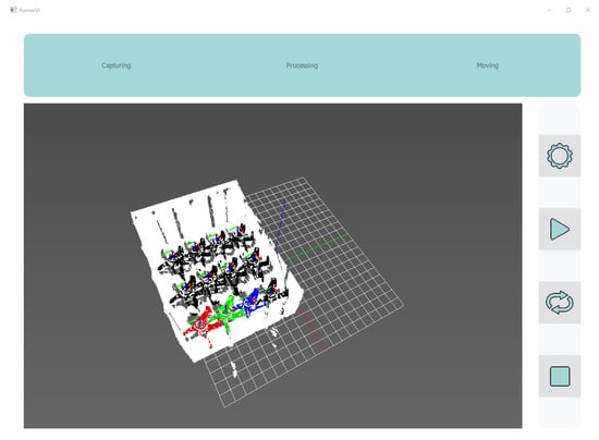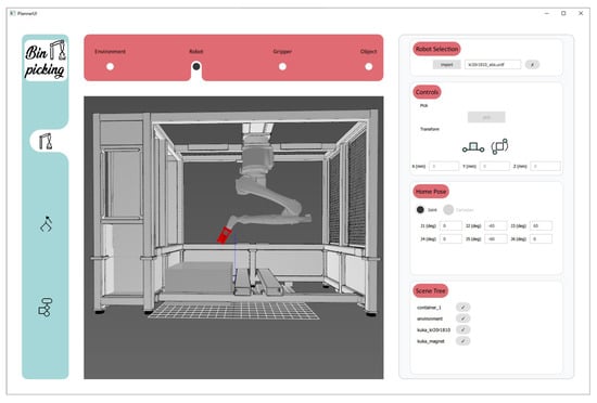 Figure 4 shows a snapshot of the user interface. The left panel shows the three main configuration steps. The first one allows the user to define the scene, the second one is used to specify the grasping points of the object, and the last one is used to select the required plugins along with their parameters. The scene specification step additionally has four steps where the user can indicate the environment CAD model, the size of the container, the robot model, its home and drop pose, the end-effector, the camera, and the piece reference model. Additionally, the right panel shows interaction options with scene objects. The center of the graphical interface is composed of a 3D view of the current scene. Figure 5 shows a picture of the monitor application, which acts as a digital twin of the real environment. The right panel displays several buttons to control the process. The top bar shows the state of the current picking cycle, while the central window shows the virtual representation of the environment. It has to be noted that both interfaces were designed with a minimalistic approach in order to ease the learning process. Experienced users can modify the configuration files to customize all the process parameters as well as the coordinate system settings. Videos of both graphical interfaces can be found in the Supplementary Materials.