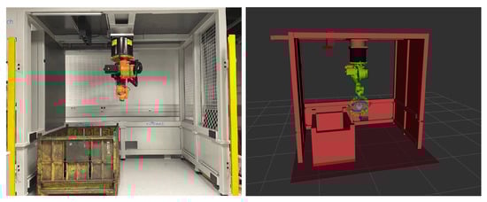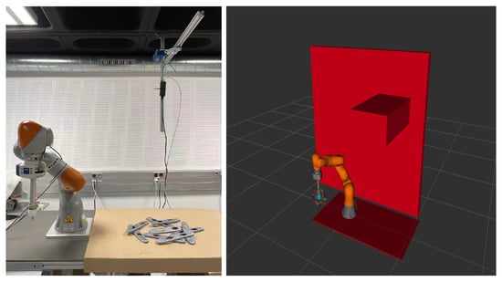 The environment setup for Use Case 2, left: the real scene, right: the virtual scene in moveit.