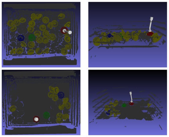 Figure 10 shows a qualitative result. The most promising localized object poses are marked in red, green, and blue, respectively, as well as the best grasping pose shown with a magnet gripper.