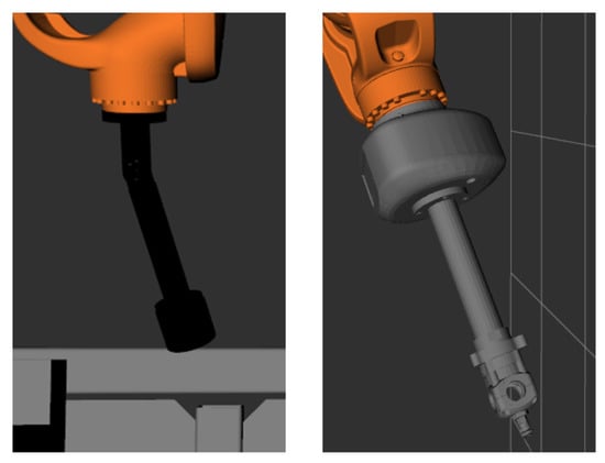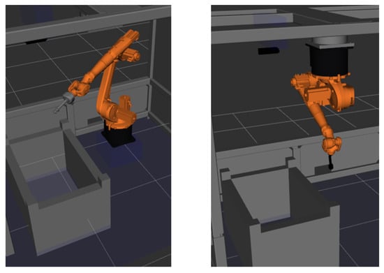 In this experiment, a reachability test is performed to compare performance in four different scenarios, a combination of two positions for the robot base (ceiling and ground, see Figure 11) with two different end-effectors (straight and angled, see Figure 12) is studied.