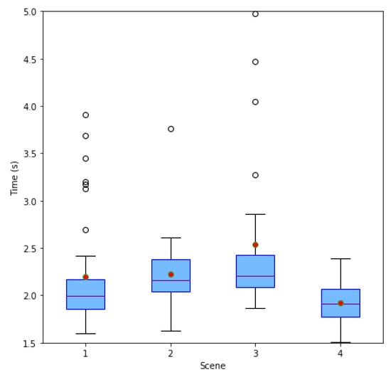 Box plot of the path planning computational times of the success rates. The purple line represents the median of the distribution, and the red dot the average.