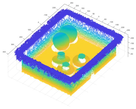 Taking the VirtualCapture service as an example, synthetic data generation starts by throwing user-provided pieces with random initial poses into a container. Physics simulation is then performed until all the pieces reach the stationary state, this simulates a real picking scene with randomly posed pieces. Finally, a rendering process is employed to obtain multi-modal information from this virtual scene, such as color image, depth map, and point cloud, as well as the ground truth data, such as the segmentation mask and 6 DOF object poses. Figure 14 shows an example of the captured synthetic point cloud.