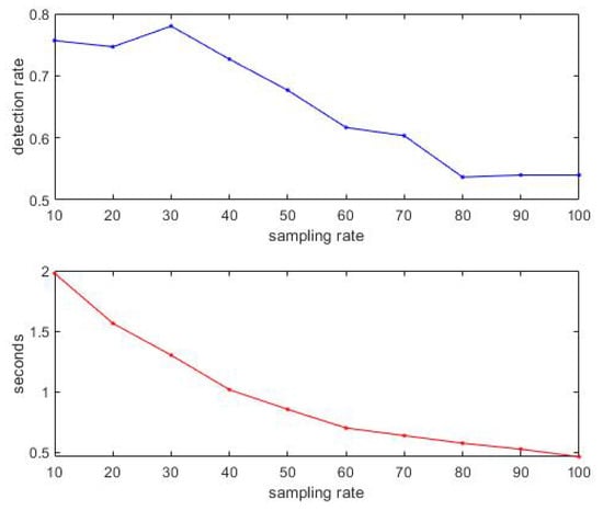 Above: detection rate under different configurations for sampling rate, Below: processing time under different configurations of sampling rate.