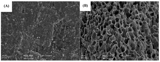 SEM micrographs (×800 and ×1000) of (A) an in natura pecan shell (PS); and (B) the biosorbent (PSB).