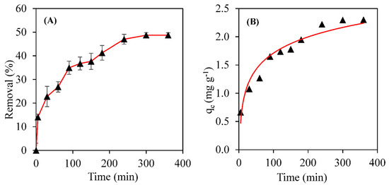 Equilibrium time for the CPX antibiotic. (A) the percentage of removal as a function of time; and (B) the amount adsorbed as a function of time.