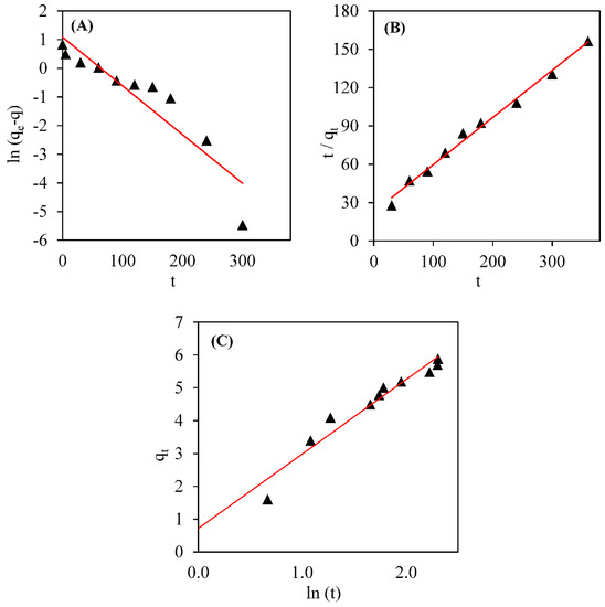 Linear plots of the (A) pseudo-first order kinetic model, (B) pseudo-second order kinetic model, and (C) Elovich model for ciprofloxacin adsorption by the biosorbent made of pecan shells.