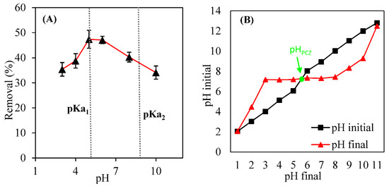 (A) Effect of pH on the removal capacity of the CPX and (B) the zero charge point pH.