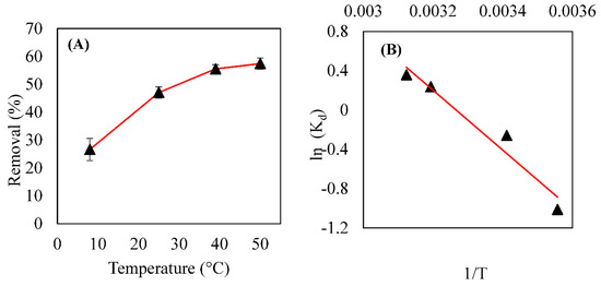 The evaluation of the effects of temperature and thermodynamics provides information about the adsorption mechanism. The adsorption test was performed for different temperatures (10–50 °C). Figure 7A shows the results. Based on the graph, there is a noticeable improvement in the CPX removal process as the temperature rises; this is because at the mildest temperature tested (10 °C) the removal was approximately 26%, while for the high temperature (50 °C), the total removed content was almost 60%. In order to investigate the thermodynamic parameters of the process, the van’t Hoff graph (Figure 7B) was plotted; through this graph the variation of Gibbs Free Energy (∆G), enthalpy (∆H), and entropy (∆S) was determined, as Table 4 shows.