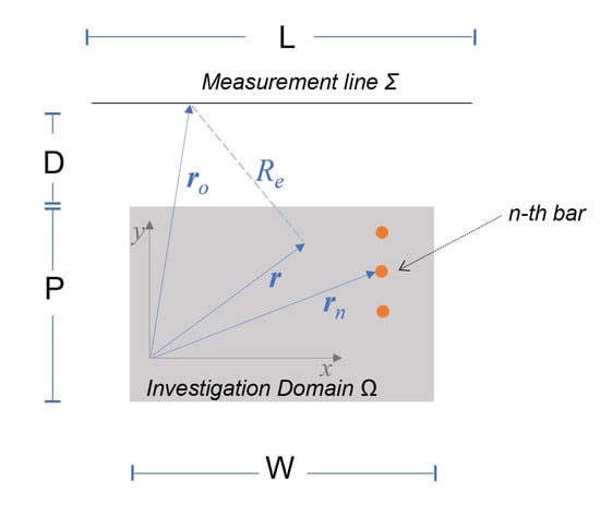 where the meaning of the symbols is immediately understandable by comparison with (16). Once the geometry of the investigation domain and measurement configuration is fixed, matrix can be computed. Subsequently, its inversion is performed using truncated singular value decomposition (TSVD). To this end, it must be considered that the analysis of the behavior of the singular values allows us to determine if enough data have been collected to retrieve the unknown. That is, the so-called “information content” of the data can be analyzed a priori, and it depends on (a) the measurement configuration, the frequency bandwidth, and the measurement line’s extent and position with respect to the investigation domain, and (b) the number and positions of the “candidate” bars. Once the data bandwidth and measurement line have been fixed, refinement of data sampling above certain values does not provide an improvement in the singular value curve, nor finally on the possibility of recovering the unknown [,]. As a final step in the inversion procedure, a threshold is applied to the recovered function , where the indices corresponding to values above the threshold indicate the positions of the detected bars.