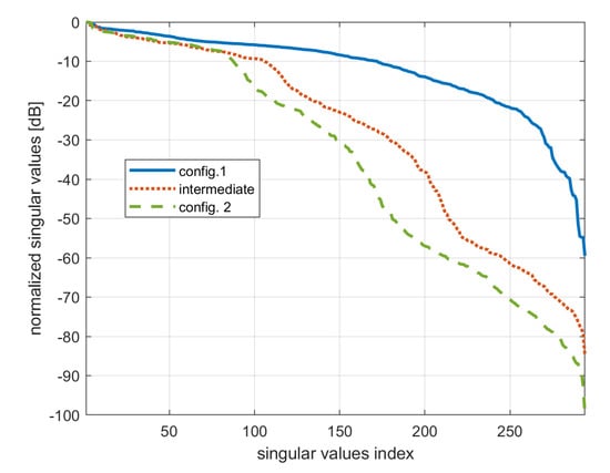Singular values of for different measurement configurations. Intermediate configuration uses same D as config. 1 and maximum frequency as config. 2.