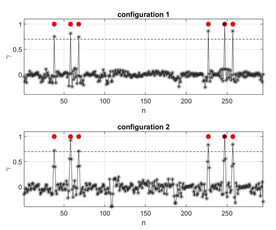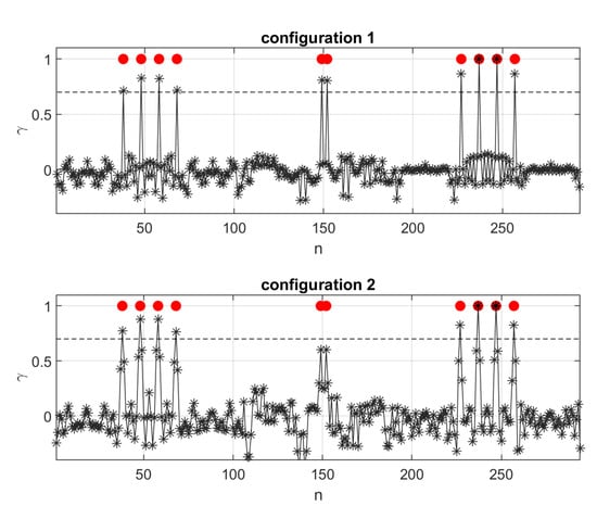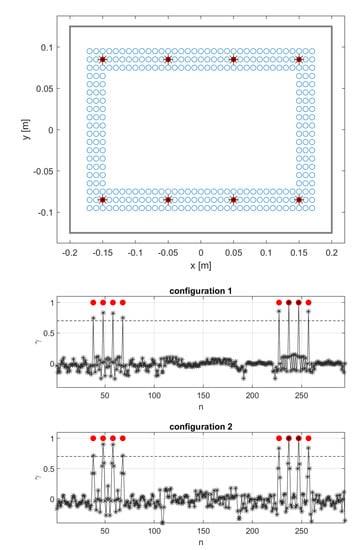 To illustrate how the algorithm works, four deployments of the bars have been considered among the positions depicted in Figure 4. The different deployments, shown in Figure 5, Figure 6, Figure 7, Figure 8 represent cases in which the bars are regularly spaced and cases in which some bars are out of place or completely lacking. Based on the noise level of the data, a truncation value of dB was adopted in the TSVD procedure. Concerning Figure 3, this truncation level corresponds to retaining the first 112 singular values in the “worst” configuration (green line) and the first 241 in the “best” one (blue line). It should be emphasized that the number of singular values above the threshold does not depend on the actual deployment of the bars inside the structure. The corresponding results in terms of detection and localization are shown in Figure 5, Figure 6, Figure 7 and Figure 8. In all figures, the bars are numbered from the bottom left to the top right. Each figure shows a pictorial view of the reconstruction, obtained after thresholding, at the top, and the reconstructed function at the bottom. As can be seen, when the number of retained singular values is higher, the bars are successfully detected. In fact, in this case, the recovered function exhibits a very clear behavior, which makes the procedure insensitive to the choice of threshold. In contrast, in the case of a lower number of singular values, some of the bars are not detected, and the choice of the threshold becomes crucial. Moreover, a lower threshold level causes the detection of false bars.