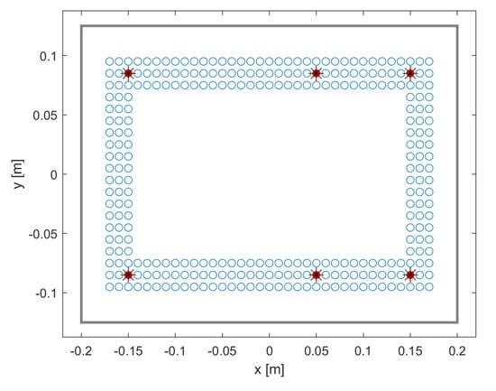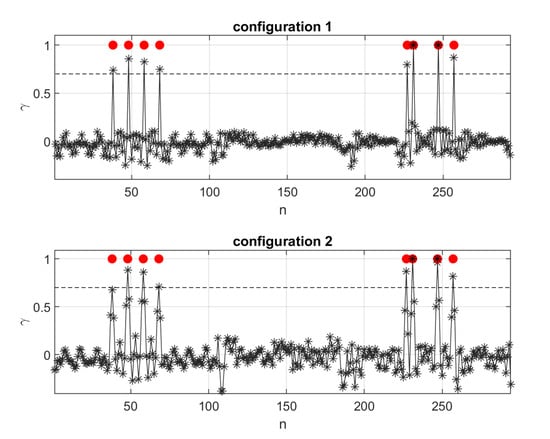Equation (12) allows the formulation of the inverse problem as the detection and localization of bars within a predetermined number of “candidate” positions. Following the same approach as in [], we define a new discrete function , , whose value is 1 if the position is occupied by a bar; otherwise, it is equal to 0. Thus, the problem is recast as a discrete equation as follows: