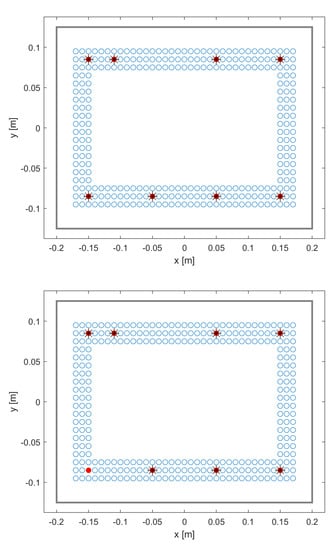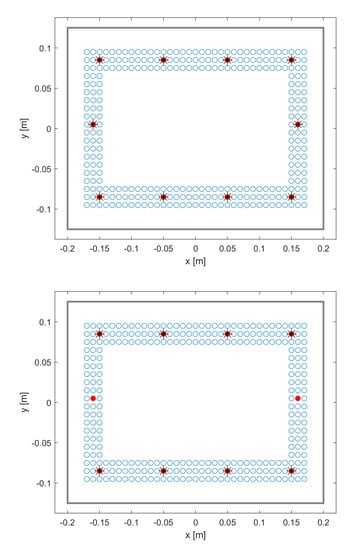 Bars’ detection (top) and reconstructed for the two measurement configurations (bottom). Red circles represent actual bars (two bars lacking with respect to Figure 5). Black stars represent detected bars. A threshold of has been applied.