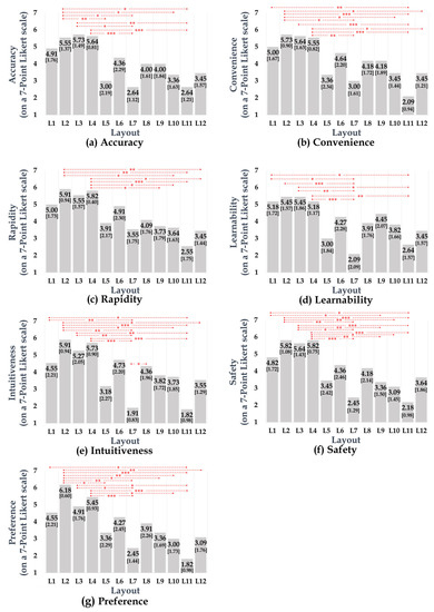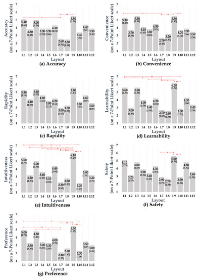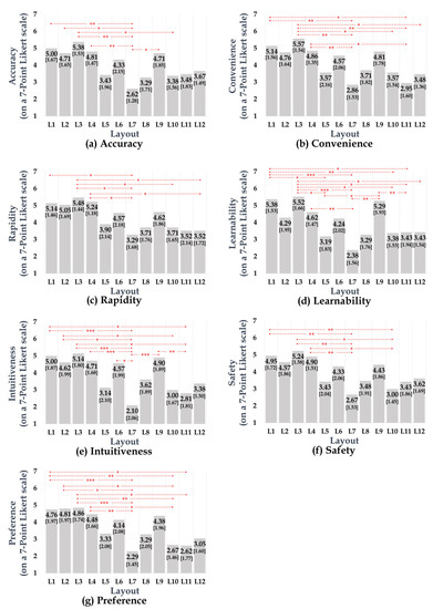 Mean and standard deviation of each subjective rating measure for each layout: (a) accuracy, (b) convenience, (c) rapidity, (d) learnability, (e) intuitiveness, (f) safety, and (g) preference. * p < 0.05, ** p < 0.01, *** p < 0.001.