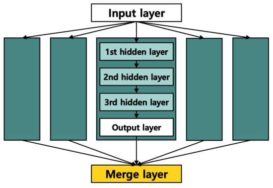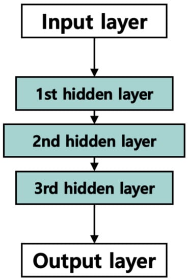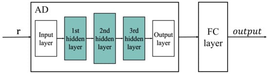 The AD, which plays a central role in decoding of the RM code, is modified from a conventional AE. Figure 1 shows the basic structures of the conventional AE and the proposed AD, highlighting the difference between the number of nodes in two different hidden layers. The number of nodes in the hidden layer of the AE in Figure 1a is less than that of the input layer. In comparison to the AE, the number of nodes in the hidden layer of the AD in Figure 1b is larger than that of the input layer. Figure 2 shows the typical structure of an AD that is composed of three hidden layers for the decoder; the number of nodes in each layer is presented in Table 2. The number of nodes in the input layer is the same as the length of the codeword n. The number of nodes in the first hidden layer is , in the second hidden layer is , in the last hidden layer is again , and finally the output layer becomes n again. In general, a neural network with a multilayer perceptron shows much better performance than a single-layer perceptron. From this perspective, we can speculate that the hidden layer structure of the AD is more suitable for decoding short length codes, such as RM code, than the AE, in which the number of nodes of the hidden layer becomes smaller as the depth of the hidden layer increases, which may result in a smaller number of nodes, especially in the middle of the hidden layer, resulting in poor decoding performance.