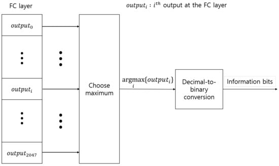 The RM code of bits with the minimum Hamming distance of used to encode bits of message is denoted as [15,18]. To illustrate the proposed decoding model, we consider two cases of RM code, and of code length 16, because the model training for longer code consumes more time. Figure 3 shows the proposed RM decoder structure constructed in such a way that the AD of Figure 2 is followed by one fully connected (FC) layer with the number of nodes defined as , and, thus, for and for . Because is equivalent to the number of all possible messages transmitted, we use the FC layer as the output layer. Moreover, a softmax activation function is used to normalize the output of the model to a probability distribution over all possible transmitted messages. Figure 4 shows the method used to estimate the transmitted message bits of the (16,11) code of from the output layer. The output node index of the FC layer is the decimal value corresponding to the message bits, and the transmitted message bits are estimated by converting the index of the maximum output node value into binary bits.