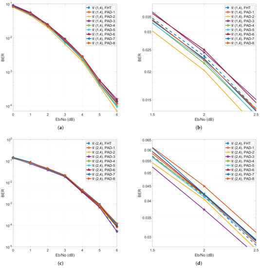 To improve the BER performance of the RM decoder using a single AD, we present a PAD composed of multiple ADs. We call an AD in a PAD a constituent auto-decoder (CAD). To illustrate the structure of a PAD, we set the number of CADs in the PAD to five, as shown in Figure 6, where the output layers of all CADs are simply added at the merge layer with nodes. Each CAD has the same structure, except for the different number of nodes at the first, second, and third hidden layers, as described in Table 6, where the first and the third hidden layers have the same number of nodes; thus, we find the symmetry structure of the PAD based on the second hidden layer or middle layer. As in the case of the AD, the activation functions for the hidden and output layers of CADs in the PAD are exponential linear unit (ELU) and tanh functions, respectively [20,21]. The PAD is followed by the FC layer, and the hyperparameters for the decoder model using PAD are the same as in the case of the AD. Figure 7 shows the BER performance for and using the conventional FHT decoder, and the proposed decoder model denoted as PAD-i, where i CADs are used. The specifications of the computer and the conditions for the BER calculation in Figure 7 for PAD are the same as those used in Figure 5 for the AD. Figure 7a shows the BER for in the range from 0 to 6 dB with 1 dB steps, and (b) in the range of 1.5 dB to 2.5 dB, which provides a better discrimination between different cases where no significant difference can be observed in terms of BER. However, PAD-2 shows the best performance. Figure 7c shows the BER for in the range from 0 to 6 dB with a 1 dB step, and (d) in the range of 1.5 dB to 2.5 dB for better observation. PAD-3 demonstrates the best performance, but there is no significant improvement as we increase the number of CADs in PAD. The comparison of decoding process times and the number of parameters for and using FHT and PADs is described in Table 7, where the higher the number of CADs in PAD, the higher the number of parameters and the complexity, and the longer the decoding process time. In (1,4), the number of parameters of PAD-1 and PAD-5 are about 10-fold different, but the decoding time is only about 1.3-fold different. This is because the computation of CADs is performed in parallel.