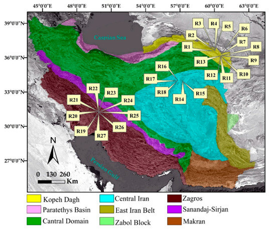 - Aghanabati, A. Geology of Iran; Geological Survey of Iran: Tehran, Iran, 2004. [Google Scholar]