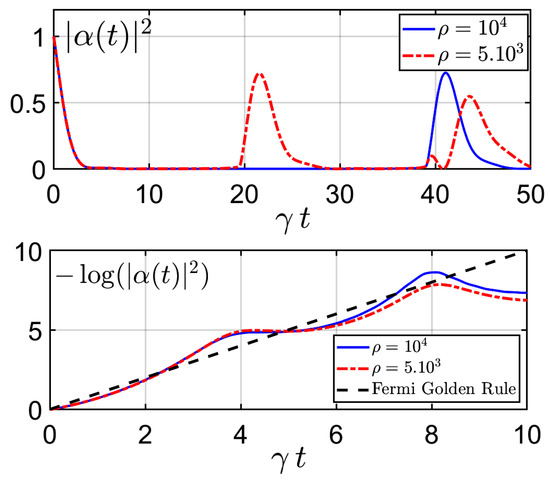 In Figure 2, we plot the survival probability obtained with this numerical method in the weak coupling regime, for two values of the density of modes, adjusting, however, the coupling constant in order to keep constant the theoretical value of the gamma factor obtained by applying the Fermi golden rule. Exponential decay is well observed, in agreement with the Fermi golden rule, but for very long times there appear large “revival” peaks which are an artefact peculiar to the discretization [3]. It is a manifestation of partial Poincaré recurrence due to the fact that when the Hilbert space of the quantum system is of finite dimension, the Poincaré recurrence time is finite (and its value is the smallest common multiple of all the eigenfrequencies of the Hamiltonian in Equation (24)). The Poincaré recurrence time increases when the density of modes increases as we can check comparing the red and blue recurrences, illustrating that, at least in the weak-coupling regime, the Poincaré recurrence goes to infinity in the continuum’s limit.