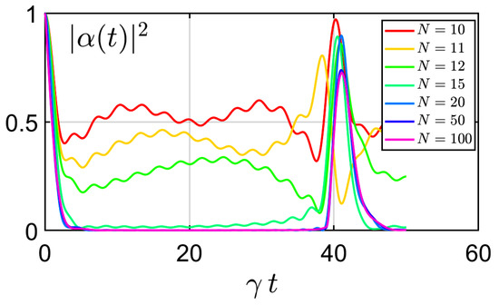 In order to better understand the implications of our toy model, we plotted the survival probability of the initially excited atom/fluorophore in function of the coupling to the cavity, varying the parameters of the model. These parameters are: which is the density of states in the comb (with equal to the difference for ); N is the number of modes and the coupling between the “atom” and the “cavity”. is thus equal to the “continuum” bandwidth , while the theoretical value of the gamma factor obtained by applying the Fermi golden rule is denoted . It is equal to .