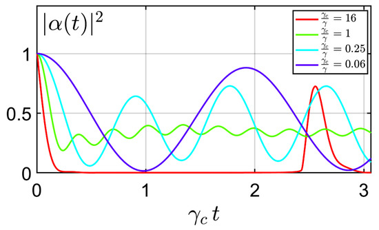 As can be seen from Figure 4, fractional Poincaré recurrences appear at the weak–strong transition (). In the strong-coupling regimes the revivals become indistinguishable from Rabi oscillations. The nature of Poincaré recurrences is clearly different in the weak- and strong-coupling regimes: in the weak-coupling regime they are an artefact of the discretization; in the strong-coupling regime, (fractional) Poincaré recurrences correspond to Rabi oscillations.