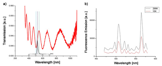 In order to understand better the radiative response, we performed time-resolved measurements of the emitted fluorescence intensity (Figure 6b). The best fits of experimental results are obtained with a double exponential function that gave rise to a long decay time (of ca. 12.2 ns) that is related to the actual lifetime of the probe in this particular environment, and a short decay time (of ca. 1.6 ns), is associated with different nonradiative processes that affect the radiative dynamics of the dye. After that, we perform the steady-state investigation of the perovskite embedded into the plasmonic cavity at two different temperatures (room temperature 298 K and 10K). The sample was excited from outside the cavity; the excess energy is necessary for creating a complex metastable excited state that will firstly follow a complicated non-radiative decay process before arriving at the radiative excited dipole state considered in Section 3. The steady-state response of the perovskite within the cavity is presented in Figure 7 and shows the signature of Rabi splitting that confirms that strong coupling between cavity and probe is achieved. As can be seen from Figure 7b, the splitting remains observable at room temperature, even though the height of the peaks diminished by then due to various sources of decoherence that increase with increasing temperature of the sample. Figure 7a exhibits the typical response of a Fabry–Pérot cavity.