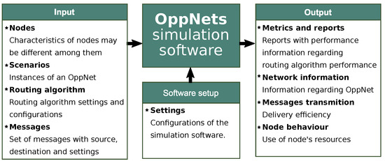 Figure 2 shows the elements involved when simulating an OppNet. These simulation elements are input, output and software setup. The inputs define the behavior of the network, for example, nodes and message characteristics. Instead, the simulation’s output is the information obtained after the simulation, for example, routing algorithm performance metrics and delivery information of messages. Most of the time, performing a post-simulation analysis from the data obtained as the output may be necessary. It is expected that different simulation parameters return different outputs since the simulation is sensible to setup changes [31].