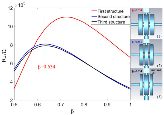 In this paper, three structures with different cavity length are optimized. The simulations start from simple structures of which the three cells have equal length. The first structure is that each cell length is as Equations (2) and (3) with of 0.634. Simulation shows the acquire its maximum value at of 0.72. To enable the acquire its maximum value at of 0.634, the simulations show that should be equal to 0.551 which is called as the second structure. The reason why the value of with the peak is not identical with that of the design is from the influence of the beam pipes at both ends. The attenuation distance of the RF field is much longer than t/2 at the beam pipe, so the electron beam experiences a longer distance than the cavity length determined by Equations (1) and (2). To make the value of with the peak the same as the design , the length of the end cell should be shorter than that of the middle cell. The third structure is proposed that the middle cell length is with of 0.634 and the end cells length is shortened. Figure 2 shows the of the three structures with different electron beams. It is shown all the three structures can produce deflecting force for electron beams with larger than 0.5. The simulated values of the three structures are with pure copper, respectively. Finally, the first structure with the largest cavity length is selected. It can produce the maximum deflecting effect to the 150 keV electron beam with of 0.98 MΩ. It also can provide enhanced deflecting ability to the electron beam with higher energy.