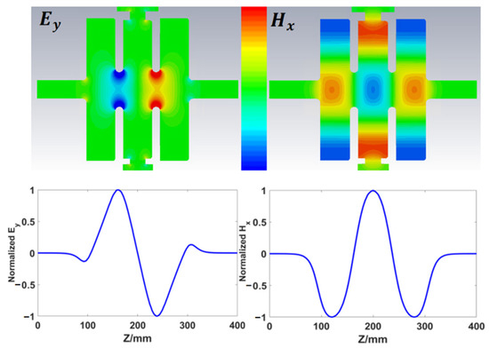Figure 3 illustrates the working mode’s transverse electromagnetic field which plays a major role on deflecting electron. The top left plot is the y component of the electric field . The top right plot is the x component of the magnetic field . The bottom plots are normalized and distributions along the cavity axis, respectively.