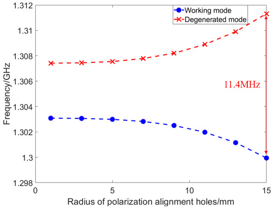 is the working mode in the deflecting cavity which exists degenerated modes. The present methods of mode separation are to break the rotational symmetry of the cavity and fix the polarization direction, which include adding holes on the disk [20], using racetrack shaped RF coupling iris [9], cutting slots on the edge of the cavity [12,16], adding longitudinal rods in the cavity [21], using an elliptical racetrack shaped cavity [22], etc. Due to the exist of coupling slot in the middle cell, the symmetry has been broken and the frequency separation value of the two degenerated modes is about 3 MHz. To further separate the frequency, adding polarization alignment holes is selected due to the 1.3 GHz deflecting cavity has large geometric size. As the polarization direction of the working mode is y-axis, the two polarization alignment holes are chosen to locate on x-axis with center-to-center distance of 128 mm. The holes locate where the degenerated mode has stronger electric field, and the working mode has stronger magnetic field to acquire the most outstanding mode separation effect. The frequency deviation of the two modes with different hole radius are shown in Figure 4, finally the radius of 15 mm is determined, and the frequency deviation of the two modes is greater than 10 MHz.
