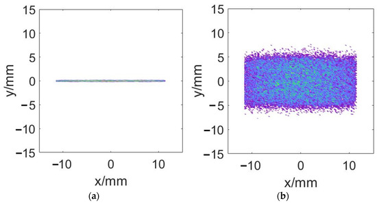 Electron beam profile at the screen in the GPT simulation. (a) Deflecting cavity is off; (b) Deflecting cavity is on.