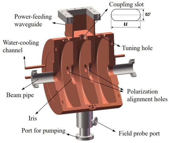 There is a slot to bring RF power in to establish the electromagnetic fields and to deflect the beam. The slot is on the top of the middle cell with a racetrack shape. To guarantee the symmetry of RF field in the cavity, a same size slot is placed at the bottom of the middle cell which can be used for pumping. With mechanical design presented in the next section, the top height of the coupling slot is 149.19 mm. For this normal conducting cavity, the coupling factor of the input port is set to about 1.05, the should be about with the consideration the actual is 95% of the simulated value with pure copper. It is concluded from the simulation that the length u of the coupling slot is 58.9 mm and the width w is 30.7 mm. The field probe port which is used for RF measurement is placed at the side face of pumping pipe, and the external quality factor of the copper antenna is set to approximately .