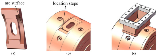 For the 1.3 GHz deflecting cavity with geometric beta of 1, the length of a single cell is slightly longer than the width of the standard rectangular waveguide, so the waveguide can be brazed to the cavity directly. For the deflecting cavity with geometric beta of 0.634, its single cell length is shorter than the width of the standard rectangular waveguide, the rectangular waveguide occupies the top of the total middle cell and partial end cells, the conventional brazing method cannot be used here. In order to solve the brazing problem, a special transition plate is designed as shown in Figure 8. Its one side equipped arc surfaces and location steps which can be brazed with the middle cell equipping the corresponding arc surfaces and steps, and the other side is flat which can be brazed with the waveguide. By using the transition plate, the waveguide brazing has ignored influence on the end cells.