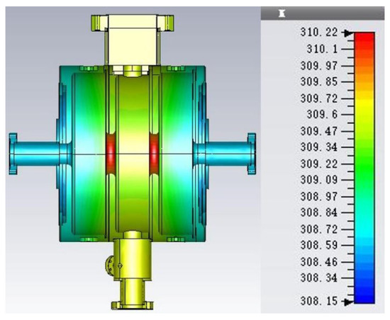 The cooling design is slotting a C-type water channel at both end walls with a rectangular section of 12 mm × 6 mm. When the water flow is 3 L/min and the inlet water temperature is 35 °C, the temperature rise of the outlet water is about 0.48 °C, which leads to negligible changes in the physical parameters of cooling water, and the heat exchange coefficient is 4492 W/(∙K). The temperature distribution of the deflecting cavity is calculated in CST. The result with 110 mm water ring radius is shown in Figure 9, in which the boundary condition is set as adiabatic.