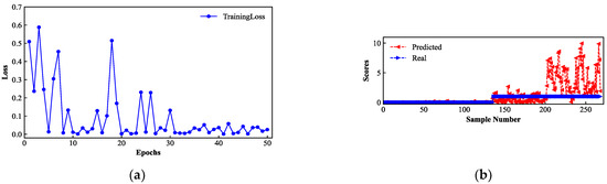 It can be seen from Figure 11a and Table 8 that the trained network model tends to be stable with about 50 epochs and 1767 s. The model is used to detect the calibration set. The prediction results are shown in Figure 11b. Generally, the crack detection prediction results are satisfactory. For non-crack images, the average thermal scores are roughly around 0; for crack images, some blurry or tiny-crack crack images tend to be 0~1, whereas clear or wide crack images are greater than 1. This further shows that the average thermal scores obtained by the proposed method can be approximately considered as the differences from the central threshold obtained with the network model, i.e., as the average thermal scores of the image become larger, the difference between cracks and non-crack images becomes greater, and the possibility of defects becomes higher. In the ROC curve, the AUC value can reach 0.9730, and finally, the thermal threshold reaches 0.0513.