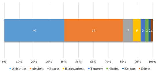 Although hydrocarbons were present in greater numbers, these were not the compounds that most contributed to the volatile profile (Figure 1). Aldehydes were the compounds that presented the highest concentrations, representing 40% of the concentration of volatile compounds, corresponding approximately to 324 µg/g. Identically to the previous class, and very close to it, the second class that most contributed to the total concentration of volatile compounds were alcohols, representing 39%, corresponding to an average concentration of 316 µg/g.