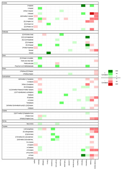 The sensory attributes have a direct relationship with volatile compounds. A Pearson correlation test was performed to verify the existence of significant correlations between the volatile compounds and the perceived olfactory sensory attributes. The most common positive attribute detected in the olive oils at the olfactory level was dried fruits, present in 98% of the samples, with a median intensity of 3.0. This attribute showed a positive correlation greater than 0.36 with (E)-2-hexenal, prop-2-yn-1-yl 2-methylbutanoate, and (Z)-3,7-dimethyl-1,3,6-octatriene. Other authors have already described the relationship between (E)-2-hexenal and nut aroma [8,36,45]. The tomato attribute showed a very significant negative correlation (p-value < 0.001) with 1-nonanol (−0.457), a compound described as mainly associated with fatty sensations [26]. Other authors have shown that 1-nonanol may be associated with the profile in polyphenols, showing a positive correlation with tyrosol and caffeic acid [46]. The attribute of cherry showed a very significant positive correlation with octanal (0.573). However, to our knowledge, this relationship has not yet been reported by other authors, with octanal being mainly associated with almond aromas [30] and citrus and fatty sensations [47]. The rosemary attribute showed very significant positive correlations (0.522) with the (E,E)-2,4-heptadienal and (E)-2-hexenal. This result is identical to that reported by other authors [32], who reported a relationship between (E)-2-hexenal and wildflower aroma. The attribute, resinous sensation, showed a significant positive correlation with 1-heptanol and α-pinene, 0.871 and 0.471, respectively. The relationship between resinous sensations and α-pinene has been mentioned in the bibliography [34]. Other attributes showed less significant positive and negative correlations (p-values between 0.001 and 0.05), as shown in Figure 2.