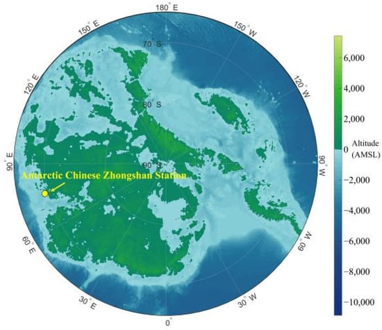 The Antarctic Chinese Zhongshan Station (76.38° E, 69.37° S, with a mean altitude of 11 m) is one of the Chinese scientific research stations in Antarctica and is located in the Lastman Massif of Southeast Antarctica, as shown in Figure 1. The colors in Figure 1 (from blue to green) represent different altitudes (above mean sea level [AMSL]), and the yellow dot represents the location of the Antarctic Chinese Zhongshan Station, which is close to the sea. For the Zhongshan Chinese Station in Antarctica, there are approximately two months of polar days and two months of polar nights every year. Importantly, Antarctica is excellent for observing atmospheric parameters, because there are no major atmospheric pollution sources, there are few human activities around the site, and disturbances are unlikely to occur. Solar activities can affect the atmosphere, mainly through the interaction between solar wind and geomagnetic fields. In this process, high-energy particles enter Earth’s atmosphere along magnetic field lines; therefore, the response of the atmosphere in Antarctica is more obvious and observable.