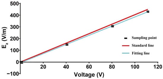 The laboratory experimental results are shown in Figure 2, where the horizontal axis is the voltage value, and the vertical axis represents the AEF. The red line and blue line represent the standard curve fitting curve, and the black squares indicate the sampling points obtained in Figure 2. Figure 2 clearly shows that the measured value does not change more than 8 V/m within 5 min for the same voltage, and the stability and linearity of this probe are excellent. However, the difference between the fitting line and the standard line is clear, which means that the theoretical value is 5–20 V/m greater than the measured value under the same voltage. This error (5–20 V/m) accounts for <5% of the standard AEF values and may be caused by the interference of the laboratory environment, the inevitable measurement system error, and the limitation of the probe measurement accuracy. These possible causes can result in the actual voltage added to the probe terminals being less than the theoretical values, or result in the actual measured voltage being lower, so that the measured values of AEF are 5–20 V/m lower than the theoretical values.