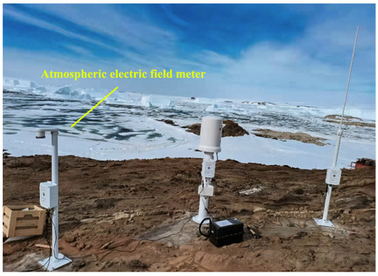 The topographic relief, buildings or communication base stations and other protrusions can affect the distribution of the AEF, making the atmospheric equipotential surface a changing surface, which in turn affects the measurement error of the AEF. Therefore, in the practical application of an AEF meter, it is generally required that it be installed in a certain elevation range where there are no protrusions, trees, signal towers, sharp objects, human activities, or other sources of interference. A photo of the observation scene at the Antarctic Chinese Zhongshan Station is shown in Figure 3. The yellow arrow points to the EFM, while the other two instruments are used to observe other relevant physical parameters. The EFM is constructed with the probe at the top, which contains the motor, stator, rotor, and circuitry, and the electrical box in the middle, which contains the power supply and data processing and data transmission equipment. The instrument is powered by main electricity and will not be interrupted by weather or external factors. The height of the mast is 1.5 m, and it serves as a support. This mast is made in bulk by the manufacturer, and its exterior is fully insulated and does not interfere with the measured value of the AEF. Due to the impact of the station, it must be placed relatively close to snow, ice, and water sources, which can cause unavoidable interference to the AEF measurements []. The area surrounding the AEF meter is empty, with no high buildings, sharp objects, grass or trees, or other sources of interference except for the other two nearby instruments. Therefore, this location is a long-term observatory station for studying the differences in the atmospheric electric environment at different latitudes and the interaction of solar activity with the Earth’s near-surface atmosphere.
