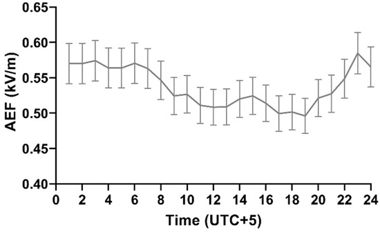 Using the website Rp5 (https://rp5.ru (accessed on: 12 July 2022)), the researchers obtained meteorological data (including relative humidity, temperature, atmospheric pressure, visual range, and wind speed) from the Zhongshan Chinese Station, Antarctica. Notably, temperature is the atmospheric temperature at 2 m above ground level (℃), wind speed is the average wind speed at 10–12 m within 10 min of observation (m/s), relative humidity is measured at 2 m above the ground (%), atmospheric pressure is the atmospheric pressure at the level of the weather station (mmHg), and visibility is the horizontal visibility (km). Many researchers have shown that space weather can have an effect on the AEF; therefore, we should exclude days of magnetic storms with Dst indices less than −50 nT, indicating moderate and large storms. Finally, 40 days were selected as fair-weather days during the 5-month measurement period (1 March–1 August 2022); the hourly average curves of these 40 fair days are shown in Figure 4. The horizontal coordinate indicates local time (UTC+5), and the vertical coordinate is the AEF in Figure 4. The black curve indicates HAEFs for each hour of the 40 fair-weather days, and error bars represent the corresponding standard deviations (±5% of measured values). The following summary based on Figure 4 can be developed: (1) most of the HAEFs are in the range of 0.5–0.6 kV/m; (2) the average curve as a whole is a “single-peak, single-valley” curve; and (3) the maximum peak value is 0.58 kV/m at 23:00, and the minimum valley is 0.50 kV/m at 19:00.