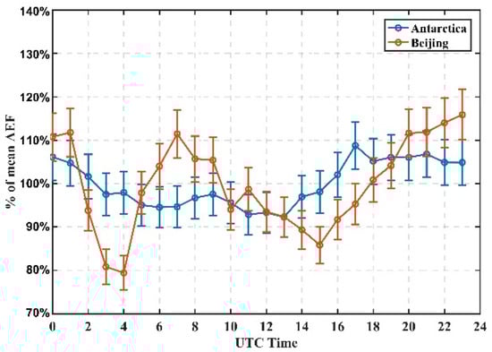 To make a comparison, using the same method, the researchers conducted long-term observations at the Thirteen Hill Station in Changping, Beijing, China (116.23° E, 40.25° N, with a mean altitude of 198 m). In the AEF observation experiment at Beijing Thirteen Hill Station, the researchers use the EFM as described above. The instrument is grounded well and mounted on top of a 2.5 m high cottage with a roof that is sufficiently wide and flat, surrounded by no grass or other protruding objects, with the nearest trees more than 10 m away and no shading; thus, these environmental factors do not affect the near-surface AEF measurements. Sunlight is plentiful here, so the EFM is powered by solar energy, and the support mast and other instrument details are the same as those used in Antarctica. After using a similar method as described above and a fair-weather criterion, the authors selected 37 fair days from a period of 5 months, as detailed above (1 March–1 August 2022). These two different hourly average curves are shown in Figure 5. The vertical coordinate is the percentage of each AEF value/mean AEF (%), and the horizontal coordinate indicates the time in UT. Then, the blue line shows the percentage curve of daily variation for Antarctica, while the red line shows the percentage curve of daily variation for Beijing. The error bar corresponds to the standard deviation of the instrument. For the average daily variation curve in Beijing, the curve is a “double-peak, double-valley” curve, with the initial peak value of 112% of the mean AEF (0.19 kV/m) at 7:00 UT and the other peak value of 116% of the mean AEF (0.19 kV/m) at 24:00 UT, the minimum valley value of 79% of the mean AEF (0.13 kV/m) at 4:00 UT and the other valley value of 86% of the mean AEF (0.14 kV/m) at 15:00 UT. From 4:00 UT to 7:00 UT, the aerosols gathered near the ground. Additionally, the aerosol concentration and AEF increased, with the maximum peak appearing at approximately 7:00 UT. From 7:00 UT to 15:00 UT, due to strong solar radiation, the vertical transport of thermal convection and turbulence was active, aerosols were continuously transported upward from near the ground, the near-surface aerosol concentration continuously decreased, and the near-surface AEF reached the minimum valley at 15:00 UT. Then, from 15:00 UT to 24:00 UT, the upper aerosol concentration was greater than that near the ground. Due to atmospheric pressure, aerosols were vertically transported, and the aerosol concentration near the ground again increased. Then, the AEF also increased, reaching another peak at 24:00 UT. From 24:00 UT to 4:00 UT, the atmosphere gradually stabilized, and the aerosol concentration decreased. In addition, the AEF decreased to another valley at 4:00 UT.