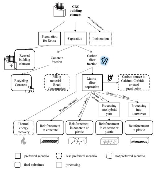 The literature shows a clear necessity of sustainable EoL scenarios for CRC. Regarding the separation of CRC, crushing by mills and camera-based sorting seems to ensure the best results by enabling good separation and the extraction of 97.7% of carbon fibers with an acceptable length (average 80 mm) for further processing. The EP matrix stays on the fibers. To separate the matrix from the fibers, a few different methods are available (pyrolysis, solvolysis, etc.). Pyrolysis is the only method already performed in an industrial scale. However, it should be considered that pyrolysis cannot be performed as many times as desired. Thus, alternative scenarios, e.g., use in steel or calcium carbide production, might represent a more suitable for carbon fibers after being pyrolyzed. Using concrete fraction in the production of new concrete is the most promising scenario because the value of the former product is achieved again in the recycled product.