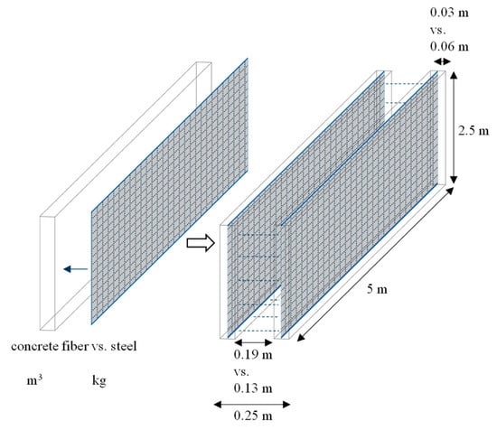 For comparison reasons, the FU for this case study is defined as the mass of re-usable material of a double wall at its EoL with an equivalent load capacity and function (carbon-reinforced wall: 5 m × 2.5 m × 0.03 m vs. steel-reinforced wall: 5 m × 2.5 m × 0.06 m) (Figure 2) (according to Otto and Adam, 2019 [58]). The reason for the defined FU is a previous conducted cradle-to-gate LCA [59], which provided the starting point of this study and a precise mass definition given by Otto and Adam, 2019 [58].