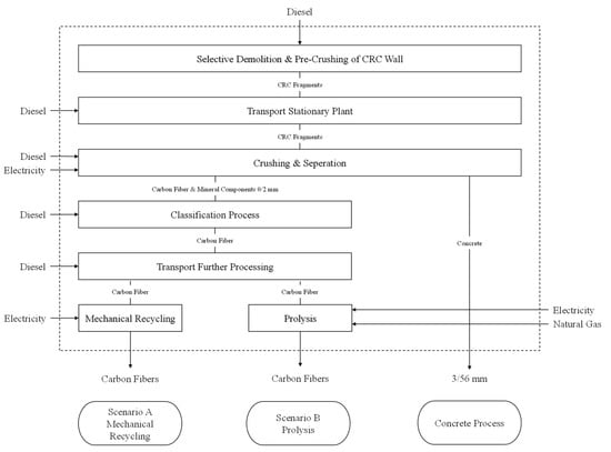 To evaluate construction materials such as FRC, in terms of environmental sustainability, life cycle assessment (LCA) can be used, and is used, to quantify environmental impacts. The basis of LCA is the evaluation of different stages of a product’s life cycle, beginning with the extraction and processing of raw materials (cradle), associated with different production and use stages (gates), and ending with its end-of-life (EoL). The EoL describes the moment a product is no longer used and disposed, recycled, or utilized in another way (down- or upcycling) [8]. Subsequently, an important step is to be able to assess the sustainability of the product’s EoL already in the design process of the material. Especially for expensive and energy-intensive carbon fibers, a definition of sustainable concepts for a reutilization or recycling paths is essential [9]. Although a consideration of the entire life cycle is relevant, until now, only few LCA studies focus on the EoL or full life cycle of CRC (see Section 2.4).