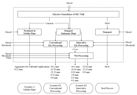 For SRC, we assume three different demolition scenarios: (A) a mobile plant at the demolition location, (B) a stationary plant with a conventional processing (dry preparation), and (C) a stationary plant with innovative processing (dry and wet preparation). For SRC, a distance of ~100 km for each transport is assumed. Figure 4 shows the modelled flow chart, starting from the selective demolition on site (Scenario A) or a stationary plant (Scenario B1 and B2). The steel reinforcement is unpacked, meaning it can be ready for recycling at any steel-producing site. The concrete can be demolished into different sizes of reusable material. Flows entering the scope of the assessment are fuel (diesel), electricity, and water.